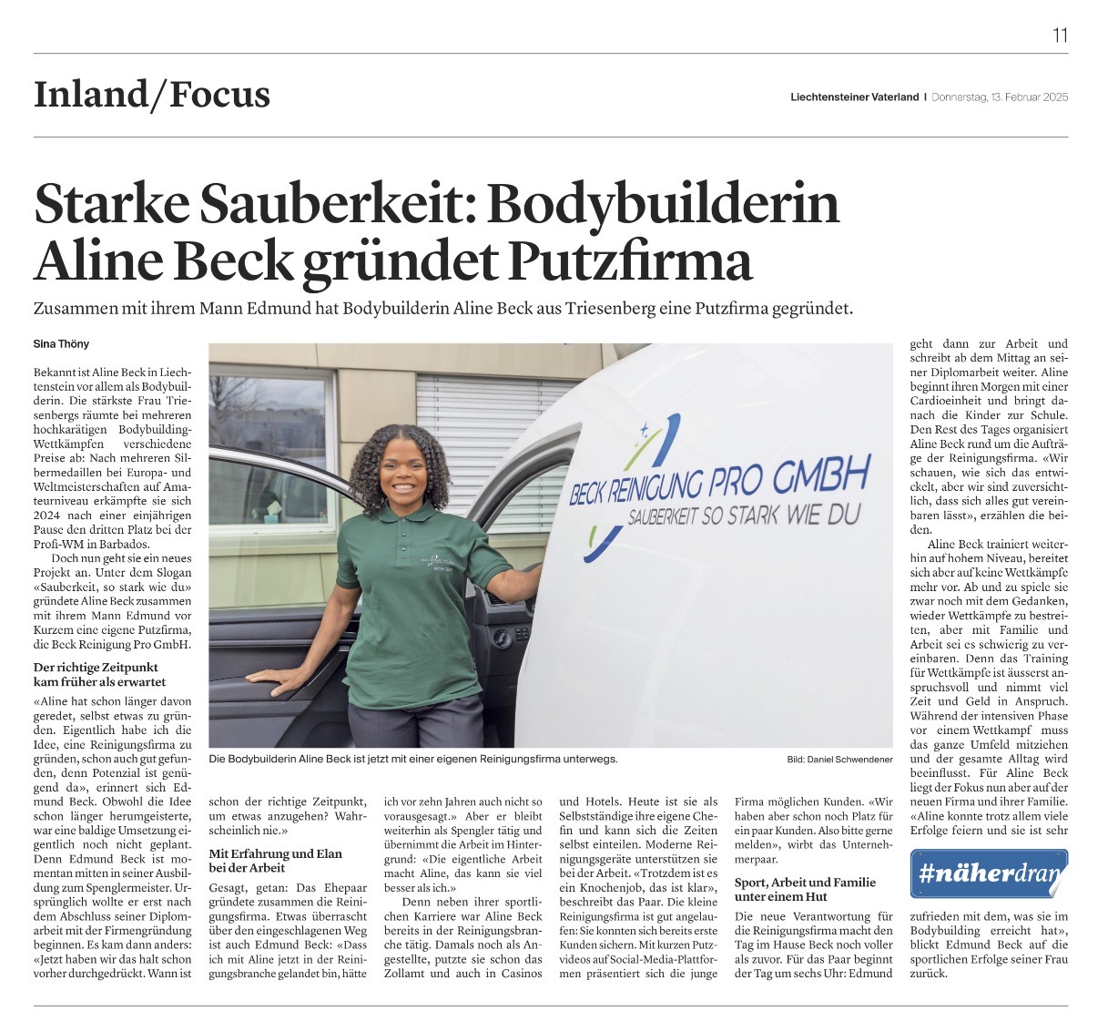 Reinigung Pro wurde von Aline Beck gegründet und wird gemeinsam mit ihrem Ehemann Edmund Beck geführt. Als familiengeführtes Unternehmen verbinden wir persönliche Betreuung mit einem hohen professionellen Anspruch. Jeder Auftrag wird individuell betrachtet und mit grösster Genauigkeit umgesetzt – für Ergebnisse, die überzeugen und langfristig begeistern.